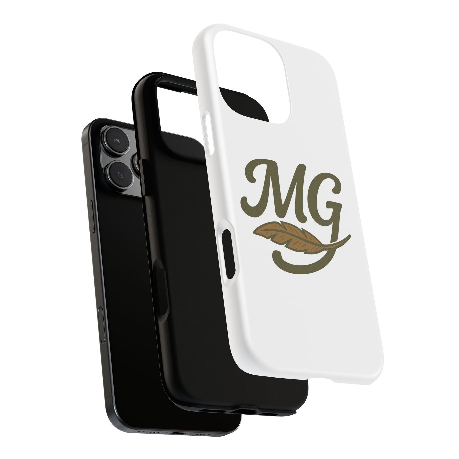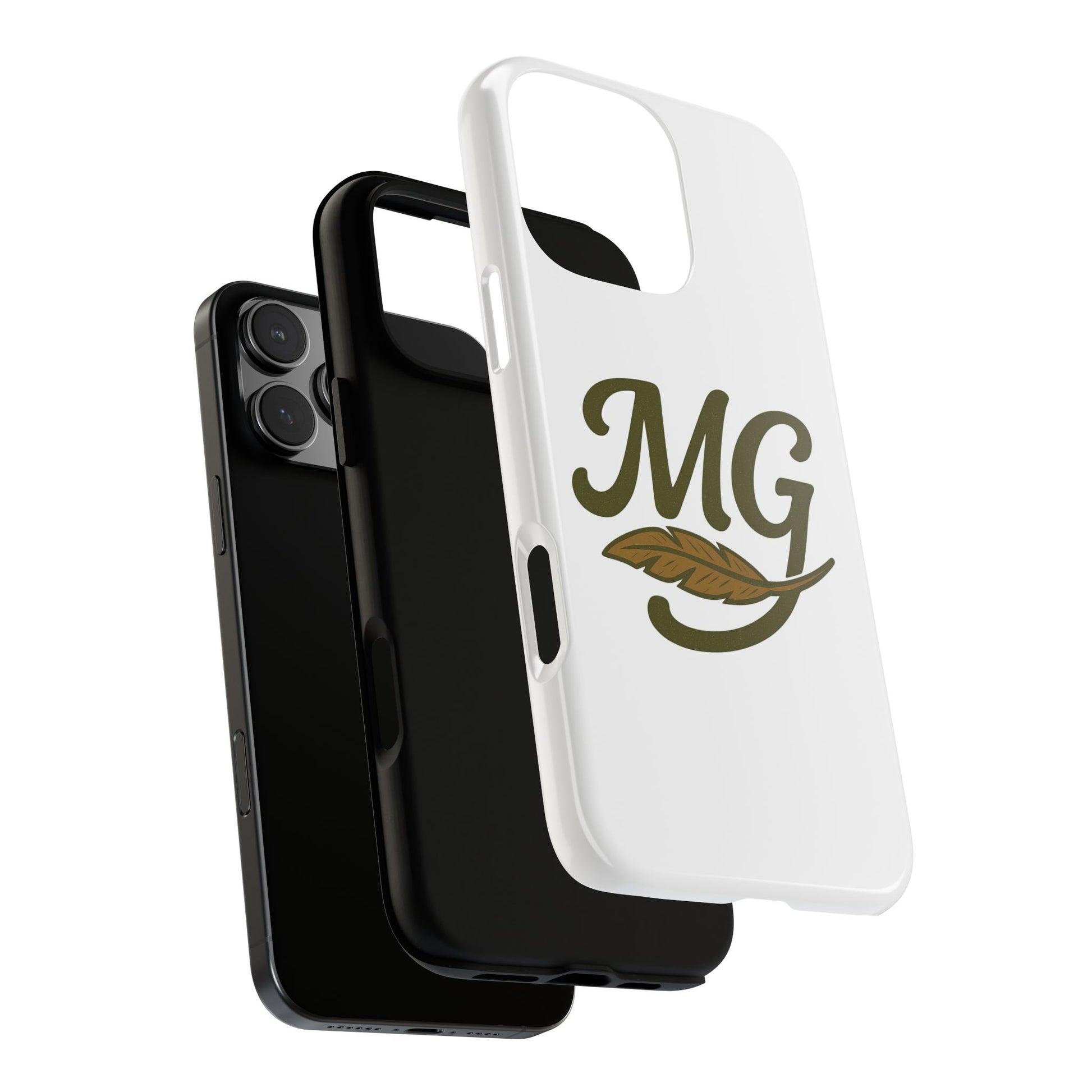 A slim, dual-layer protective phone case that blends everyday toughness with quiet, natural style. The case pairs a rigid polycarbonate shell with a soft TPU silicone liner to cushion drops and absorb shocks. A tasteful monogram ('MG') sits above a single autumn leaf motif, printed with full-wrap ink for consistent color and a clean matte or glossy finish. It resists outdoor fading thanks to UV protection and keeps ports accessible while supporting wireless charging. Lightweight and durable, it brings a subtle, outdoorsy feel to daily carry without bulk.